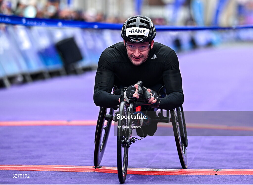 26 October 2025; Sean Frame of Scotland crosses the finish line to win the 2025 Irish Life Dublin Marathon Wheelchair race. This marks the 44th edition of the race with thousands of participants from international athletes, club runners, wheelchair-assisted participants, charity runners, and first-time marathon participants taking on the 26.2-mile challenge. Photo by Sam Barnes/Sportsfile