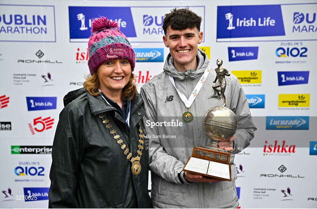 26 October 2025; Athletics Ireland President Bríd Golden, left, presented the medals to the first three finishers in the Athletics Ireland National Championships, which is incorporated as part of the Irish Life Dublin Marathon. In first place in the men’s race was David McGylnn of Waterford AC, Waterford, right, in second place was Ryan Creech of Leevale AC, Cork, and in third place was Paul O'Donnell of Dundrum South Dublin AC. Photo by Sam Barnes/Sportsfile