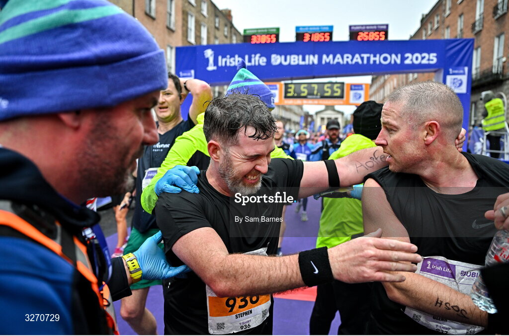 26 October 2025; Shamrock Rovers manager Stephen Bradley, left, and Shamrock Rovers assistant coach Glenn Cronin after competing in the 2025 Irish Life Dublin Marathon. This marks the 44th edition of the race with thousands of participants from international athletes, club runners, wheelchair-assisted participants, charity runners, and first-time marathon participants taking on the 26.2-mile challenge. Photo by Sam Barnes/Sportsfile