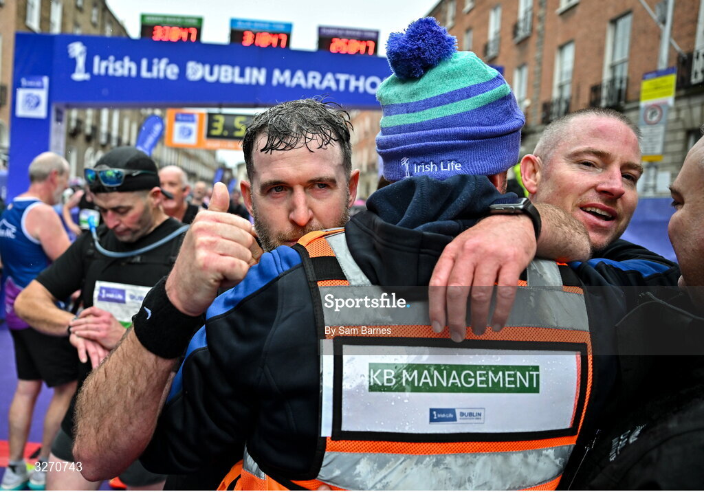 26 October 2025; Shamrock Rovers manager Stephen Bradley, left, and Shamrock Rovers assistant coach Glenn Cronin, right, after competing in the 2025 Irish Life Dublin Marathon. This marks the 44th edition of the race with thousands of participants from international athletes, club runners, wheelchair-assisted participants, charity runners, and first-time marathon participants taking on the 26.2-mile challenge. Photo by Sam Barnes/Sportsfile