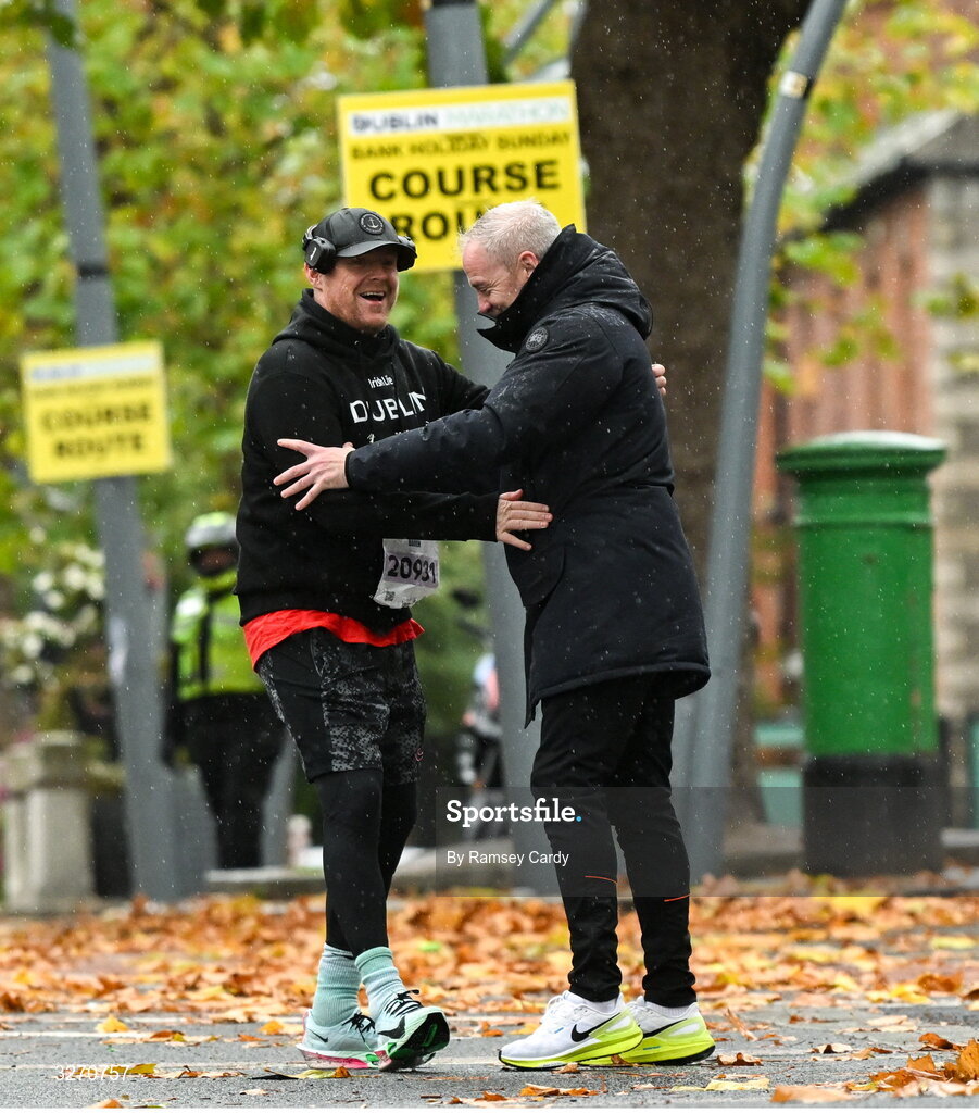 26 October 2025; Damien Duff, left, and Alan Quinn during the 2025 Irish Life Dublin Marathon. This marks the 44th edition of the race with thousands of participants from international athletes, club runners, wheelchair-assisted participants, charity runners, and first-time marathon participants taking on the 26.2-mile challenge. Photo by Ramsey Cardy/Sportsfile
