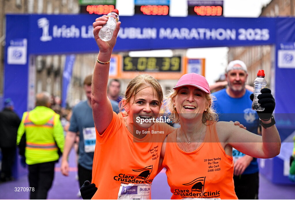 26 October 2025; Hilary Davis, left, and Aine Quigney during the 2025 Irish Life Dublin Marathon. This marks the 44th edition of the race with thousands of participants from international athletes, club runners, wheelchair-assisted participants, charity runners, and first-time marathon participants taking on the 26.2-mile challenge. Photo by Sam Barnes/Sportsfile