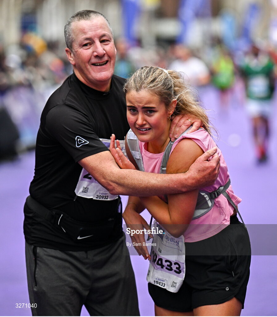 26 October 2025; Cathal O'Cleirigh, left, and Ella Ní Chléirigh during the 2025 Irish Life Dublin Marathon. This marks the 44th edition of the race with thousands of participants from international athletes, club runners, wheelchair-assisted participants, charity runners, and first-time marathon participants taking on the 26.2-mile challenge. Photo by Sam Barnes/Sportsfile
