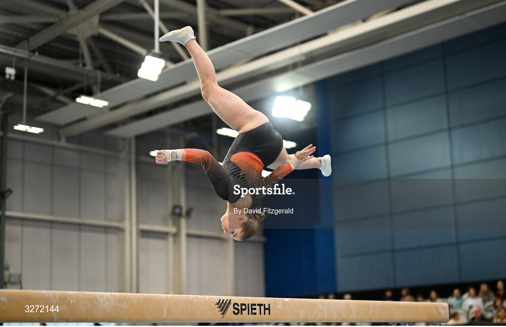 27 October 2025; Laura Nelson of Pheonix GC competes on the beam during the Gymnastics Ireland Next Gen Competition at the National Indoor Arena on the Sport Ireland Campus in Dublin. Photo by David Fitzgerald/Sportsfile