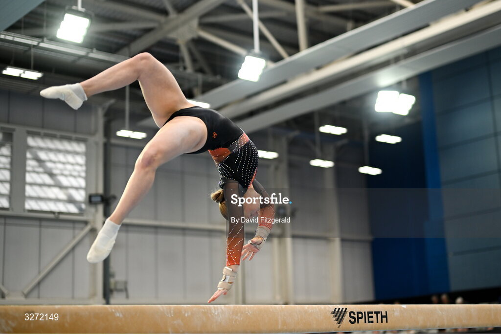 27 October 2025; Laura Nelson of Pheonix GC competes on the beam during the Gymnastics Ireland Next Gen Competition at the National Indoor Arena on the Sport Ireland Campus in Dublin. Photo by David Fitzgerald/Sportsfile