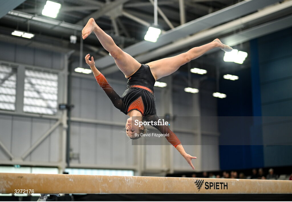 27 October 2025; Blathnaid Higgins of Pheonix GC competes on the beam during the Gymnastics Ireland Next Gen Competition at the National Indoor Arena on the Sport Ireland Campus in Dublin. Photo by David Fitzgerald/Sportsfile