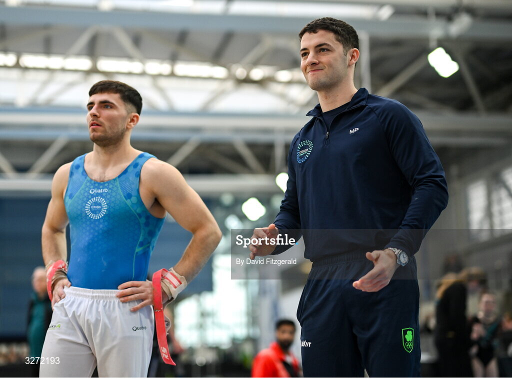 27 October 2025; Olympic gold medallist Rhys McClenaghan, right, and Eamon Montgomery of Origin Gym watch their team mates compete during the Gymnastics Ireland Next Gen Competition at the National Indoor Arena on the Sport Ireland Campus in Dublin. Photo by David Fitzgerald/Sportsfile
