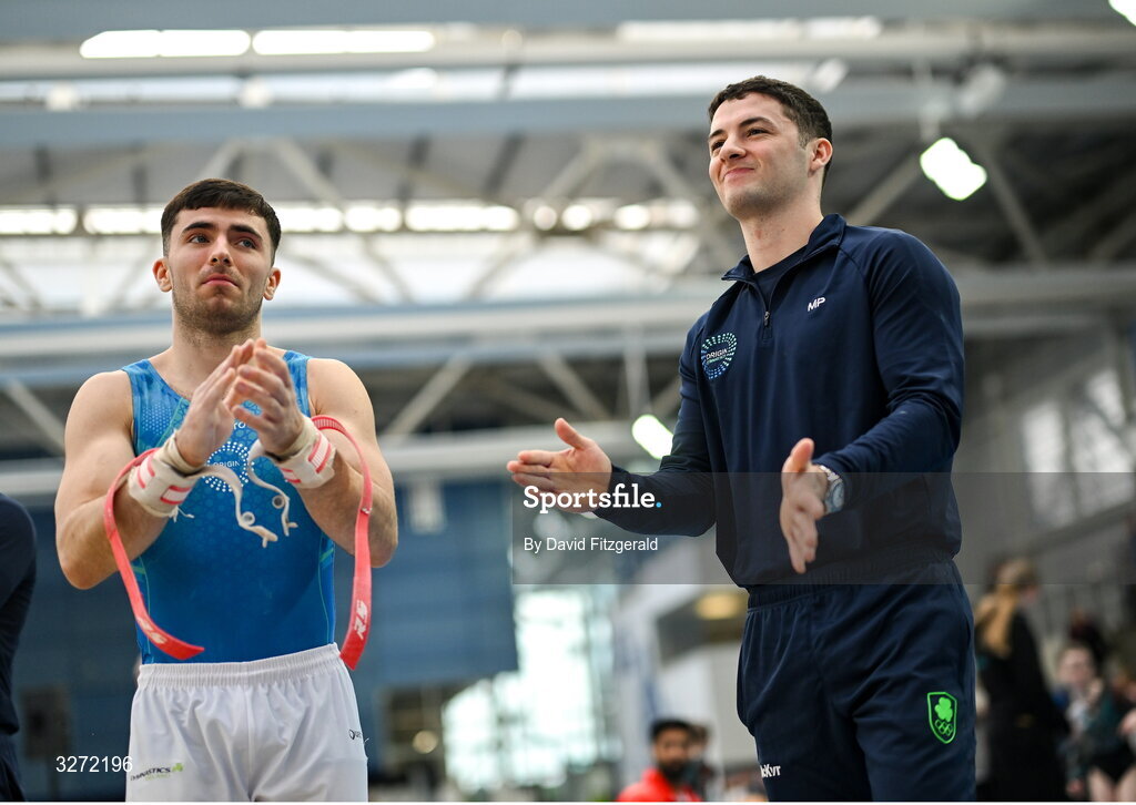 27 October 2025; Olympic gold medallist Rhys McClenaghan, right, and Eamon Montgomery of Origin Gym watch their team mates compete during the Gymnastics Ireland Next Gen Competition at the National Indoor Arena on the Sport Ireland Campus in Dublin. Photo by David Fitzgerald/Sportsfile