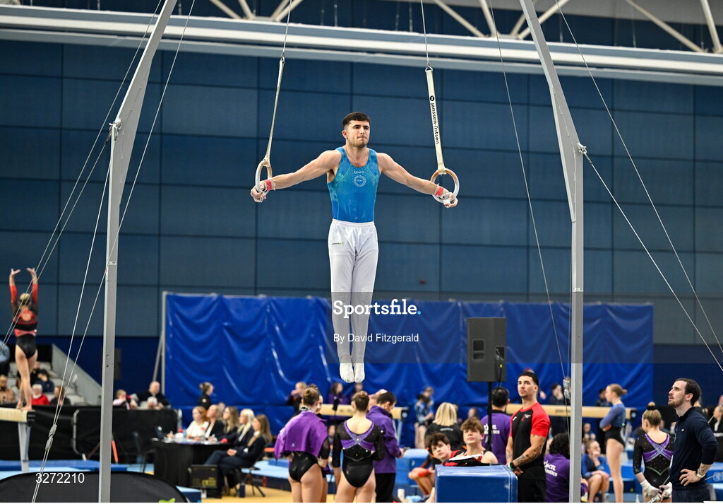 27 October 2025; Eamon Montgomery of Origin Gym competes on the rings during the Gymnastics Ireland Next Gen Competition at the National Indoor Arena on the Sport Ireland Campus in Dublin. Photo by David Fitzgerald/Sportsfile