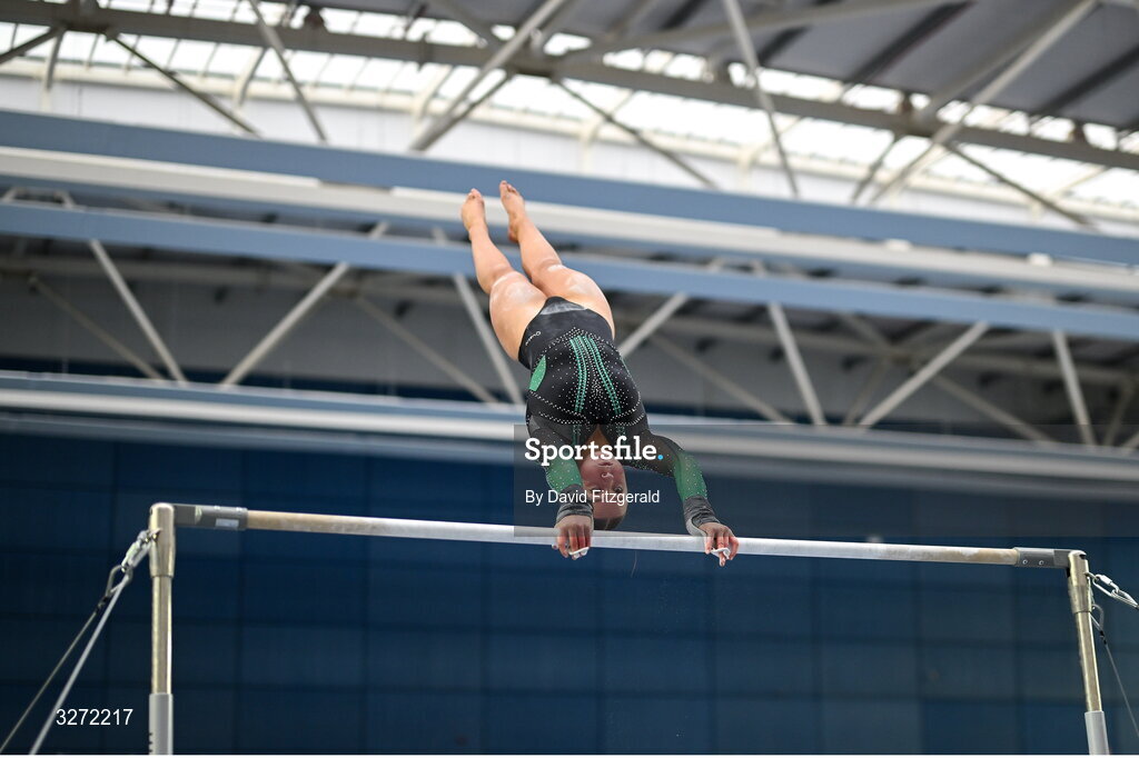 27 October 2025; Skye O'Connor of Douglas GC competes on the uneven bars during the Gymnastics Ireland Next Gen Competition at the National Indoor Arena on the Sport Ireland Campus in Dublin. Photo by David Fitzgerald/Sportsfile