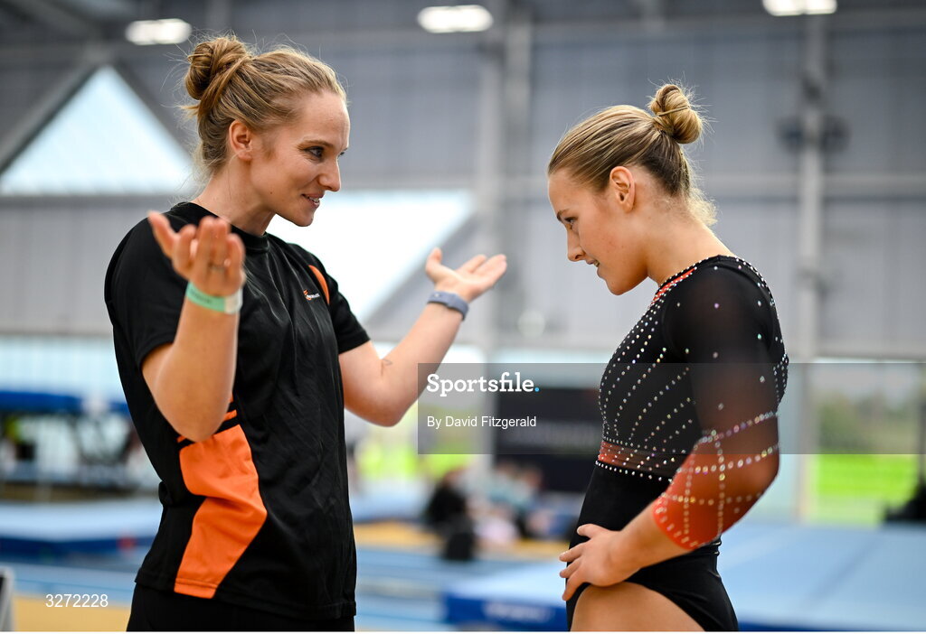 27 October 2025; Blathnaid Higgins of Pheonix GC with her coach Dr Ash Healy after competing on the beam during the Gymnastics Ireland Next Gen Competition at the National Indoor Arena on the Sport Ireland Campus in Dublin. Photo by David Fitzgerald/Sportsfile