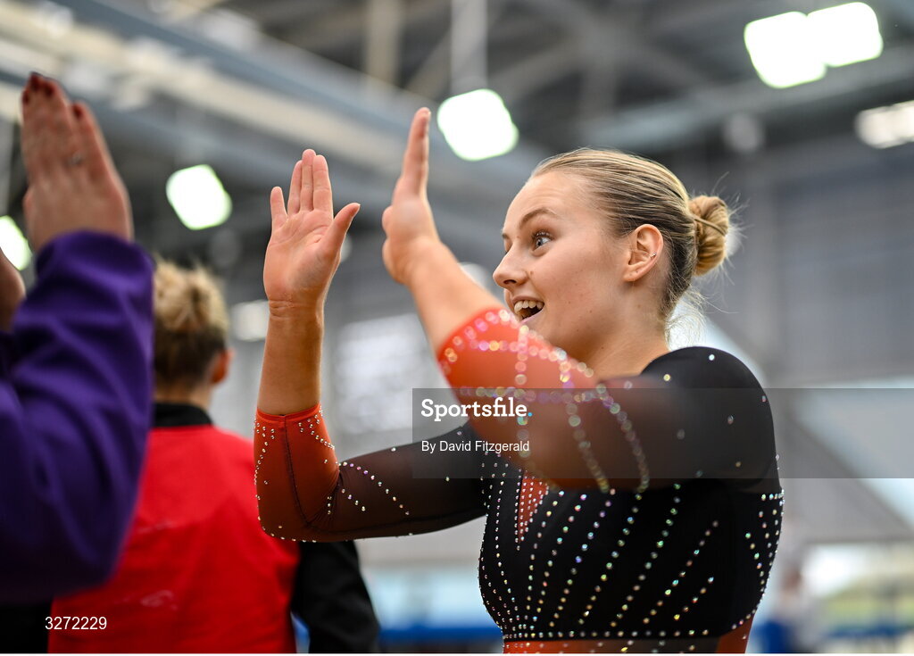 27 October 2025; Blathnaid Higgins of Pheonix GC after competing on the beam during the Gymnastics Ireland Next Gen Competition at the National Indoor Arena on the Sport Ireland Campus in Dublin. Photo by David Fitzgerald/Sportsfile
