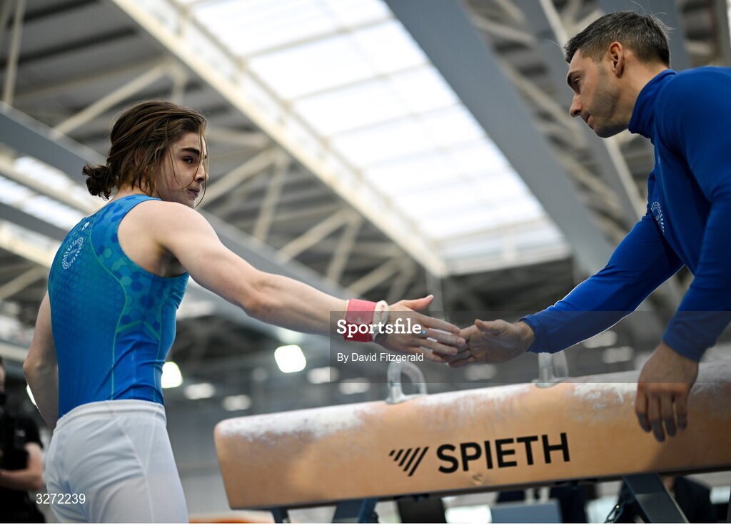 27 October 2025; CEO of Origin Gymnastics Luke Carson, right, with Michael Carson-Maguire after he competed on the pommel during the Gymnastics Ireland Next Gen Competition at the National Indoor Arena on the Sport Ireland Campus in Dublin. Photo by David Fitzgerald/Sportsfile