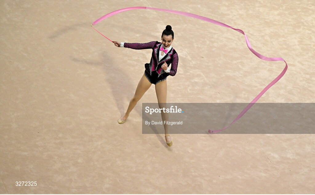 27 October 2025; Nina Caren of Excel GC competes in the Rhythmic gymnastics event during a Gymnastics Ireland Next Gen Competition at the National Indoor Arena on the Sport Ireland Campus in Dublin. Photo by David Fitzgerald/Sportsfile