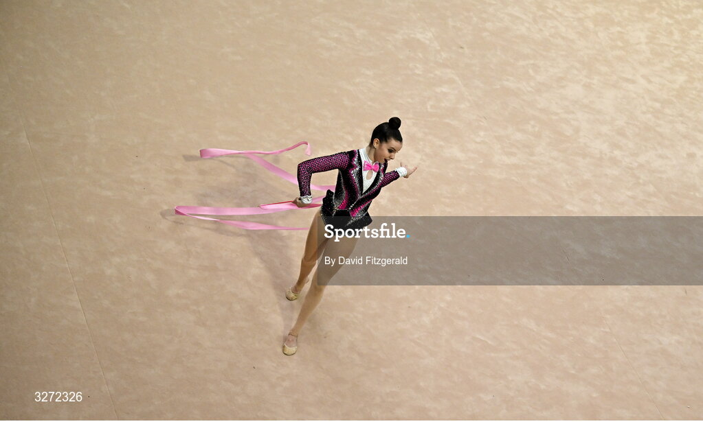 27 October 2025; Nina Caren of Excel GC competes in the Rhythmic gymnastics event during a Gymnastics Ireland Next Gen Competition at the National Indoor Arena on the Sport Ireland Campus in Dublin. Photo by David Fitzgerald/Sportsfile
