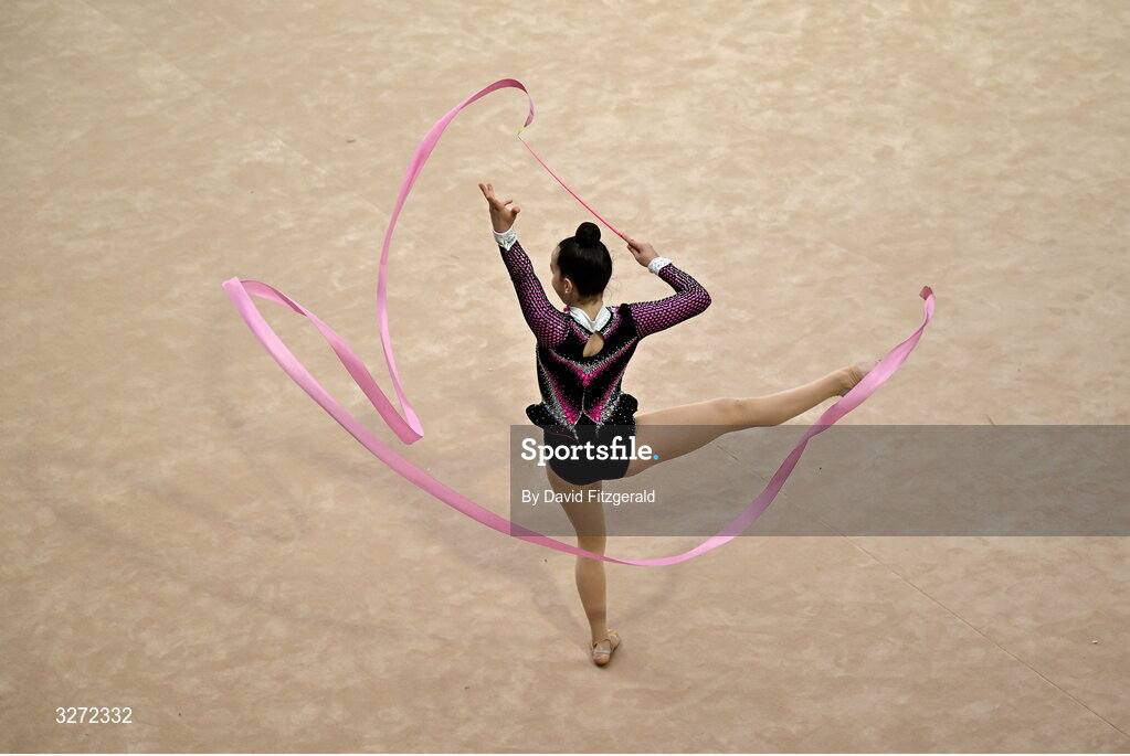 27 October 2025; Nina Caren of Excel GC competes in the Rhythmic gymnastics event during a Gymnastics Ireland Next Gen Competition at the National Indoor Arena on the Sport Ireland Campus in Dublin. Photo by David Fitzgerald/Sportsfile