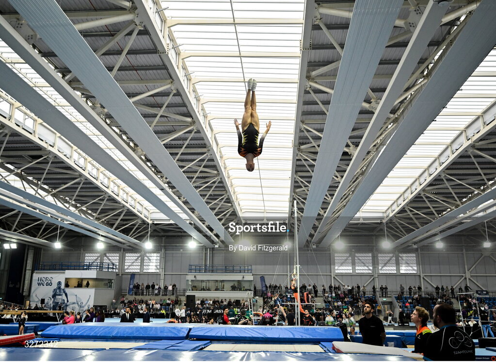 27 October 2025; Laoise Cox of Supersonic GC competes on the trampoline during a Gymnastics Ireland Next Gen Competition at the National Indoor Arena on the Sport Ireland Campus in Dublin. Photo by David Fitzgerald/Sportsfile