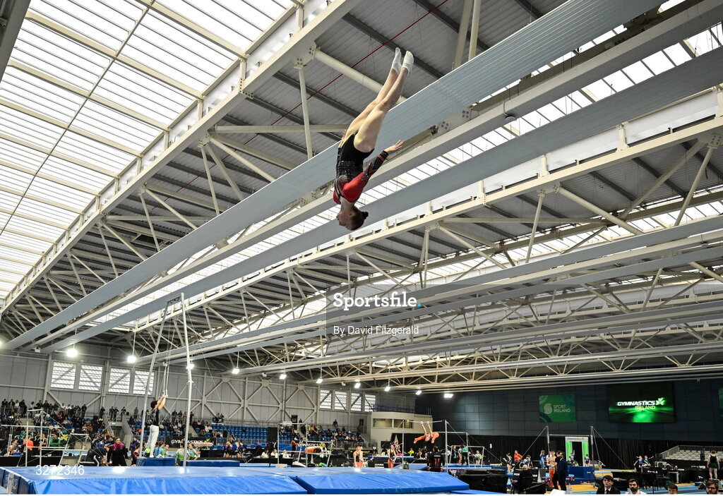 27 October 2025; Fionnuala Mulholland of Flight GC competes on the trampoline during a Gymnastics Ireland Next Gen Competition at the National Indoor Arena on the Sport Ireland Campus in Dublin. Photo by David Fitzgerald/Sportsfile