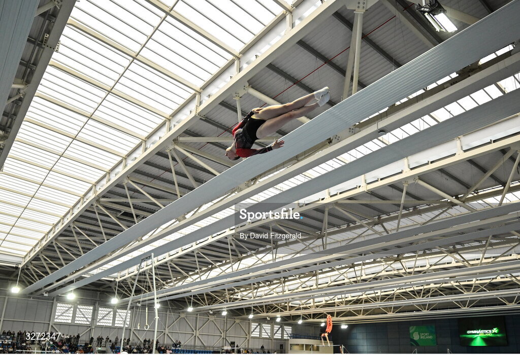 27 October 2025; Fionnuala Mulholland of Flight GC competes on the trampoline during a Gymnastics Ireland Next Gen Competition at the National Indoor Arena on the Sport Ireland Campus in Dublin. Photo by David Fitzgerald/Sportsfile