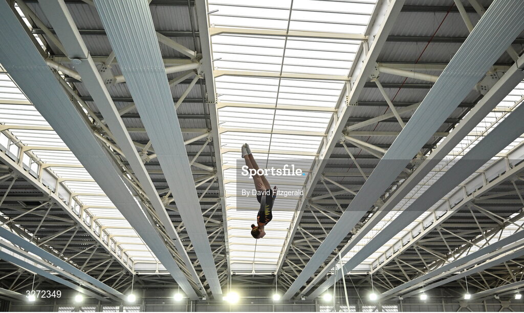 27 October 2025; Laoise Cox of Supersonic GC competes on the trampoline during a Gymnastics Ireland Next Gen Competition at the National Indoor Arena on the Sport Ireland Campus in Dublin. Photo by David Fitzgerald/Sportsfile