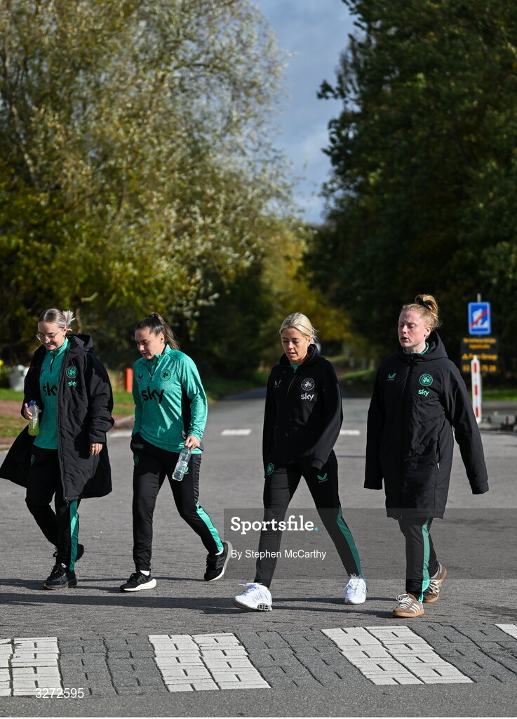28 October 2025; Republic of Ireland players, from left, Izzy Atkinson, Jess Ziu, Denise O’Sullivan and Amber Barrett during a team walk near their hotel before the UEFA Women's Nations League A/B promotion/relegation play-off second leg match between Belgium and Republic of Ireland at The King Power At Den Dreef Stadium in Leuven, Belgium. Photo by Stephen McCarthy/Sportsfile