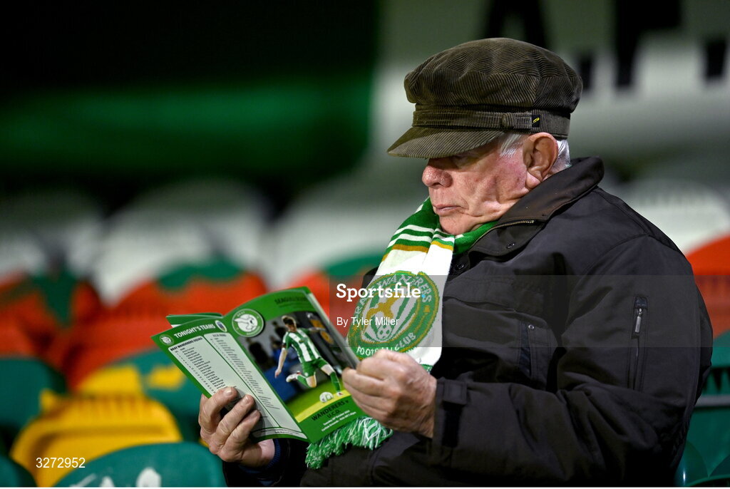 28 October 2025; A Bray Wanderers supporter inspects the matchday programme before the SSE Airtricity Men's First Division Play-Off semi-final second leg match between Bray Wanderers and UCD at Carlisle Grounds in Bray, Wicklow. Photo by Tyler Miller/Sportsfile