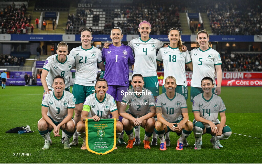28 October 2025; The Republic of Ireland team, back row from left, Ruesha Littlejohn, Emily Murphy, goalkeeper Grace Moloney, Caitlin Hayes, Kyra Carusa and Aoife Mannion, with front row, from left, Chloe Mustaki, Katie McCabe, Jessie Stapleton, Denise O’Sullivan and Marissa Sheva before the UEFA Women's Nations League A/B promotion/relegation play-off second leg match between Belgium and Republic of Ireland at The King Power At Den Dreef Stadium in Leuven, Belgium. Photo by Stephen McCarthy/Sportsfile