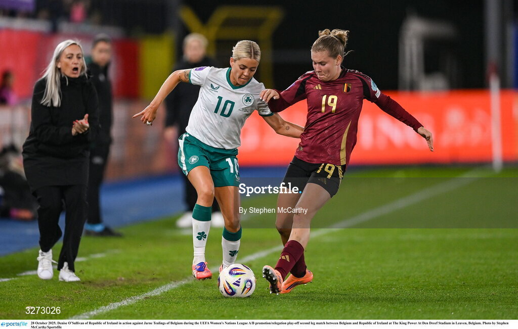 28 October 2025; Denise O’Sullivan of Republic of Ireland in action against Jarne Teulings of Belgium during the UEFA Women's Nations League A/B promotion/relegation play-off second leg match between Belgium and Republic of Ireland at The King Power At Den Dreef Stadium in Leuven, Belgium. Photo by Stephen McCarthy/Sportsfile