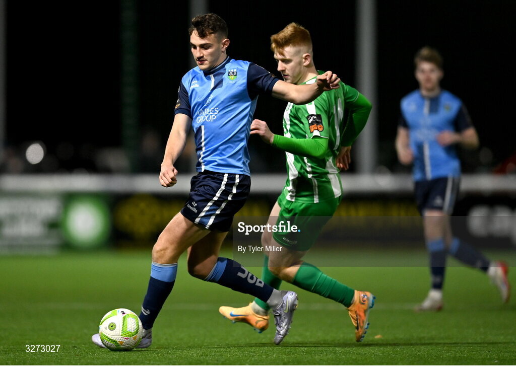 28 October 2025; Eanna Clancy of UCD in action against Cian Curtis of Bray Wanderers during the SSE Airtricity Men's First Division Play-Off semi-final second leg match between Bray Wanderers and UCD at Carlisle Grounds in Bray, Wicklow. Photo by Tyler Miller/Sportsfile