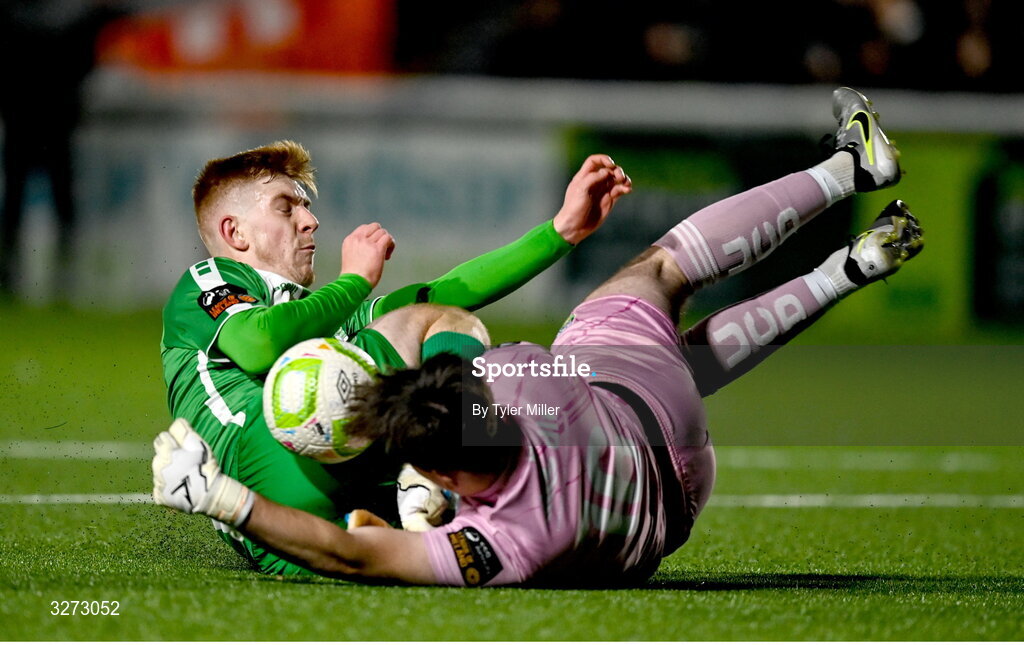 28 October 2025; Cian Curtis of Bray Wanderers collides with UCD goalkeeper Dara Kavanagh during the SSE Airtricity Men's First Division Play-Off semi-final second leg match between Bray Wanderers and UCD at Carlisle Grounds in Bray, Wicklow. Photo by Tyler Miller/Sportsfile