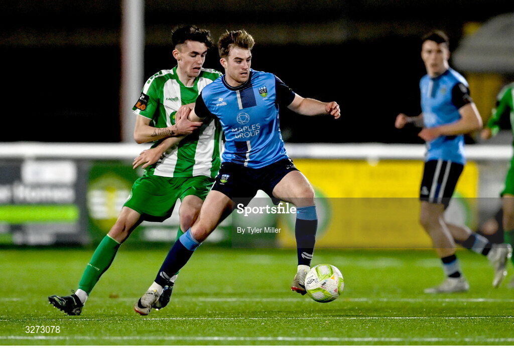 28 October 2025; Ciaran Behan of UCD in action against Rhys Bartley of Bray Wanderers during the SSE Airtricity Men's First Division Play-Off semi-final second leg match between Bray Wanderers and UCD at Carlisle Grounds in Bray, Wicklow. Photo by Tyler Miller/Sportsfile