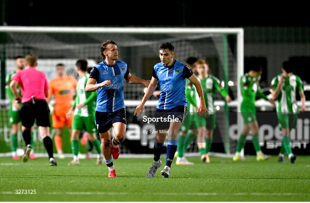 28 October 2025; Brian McManus of UCD, left, celebrates with teammate Eanna Clancy after scoring their side's first goal during the SSE Airtricity Men's First Division Play-Off semi-final second leg match between Bray Wanderers and UCD at Carlisle Grounds in Bray, Wicklow. Photo by Tyler Miller/Sportsfile