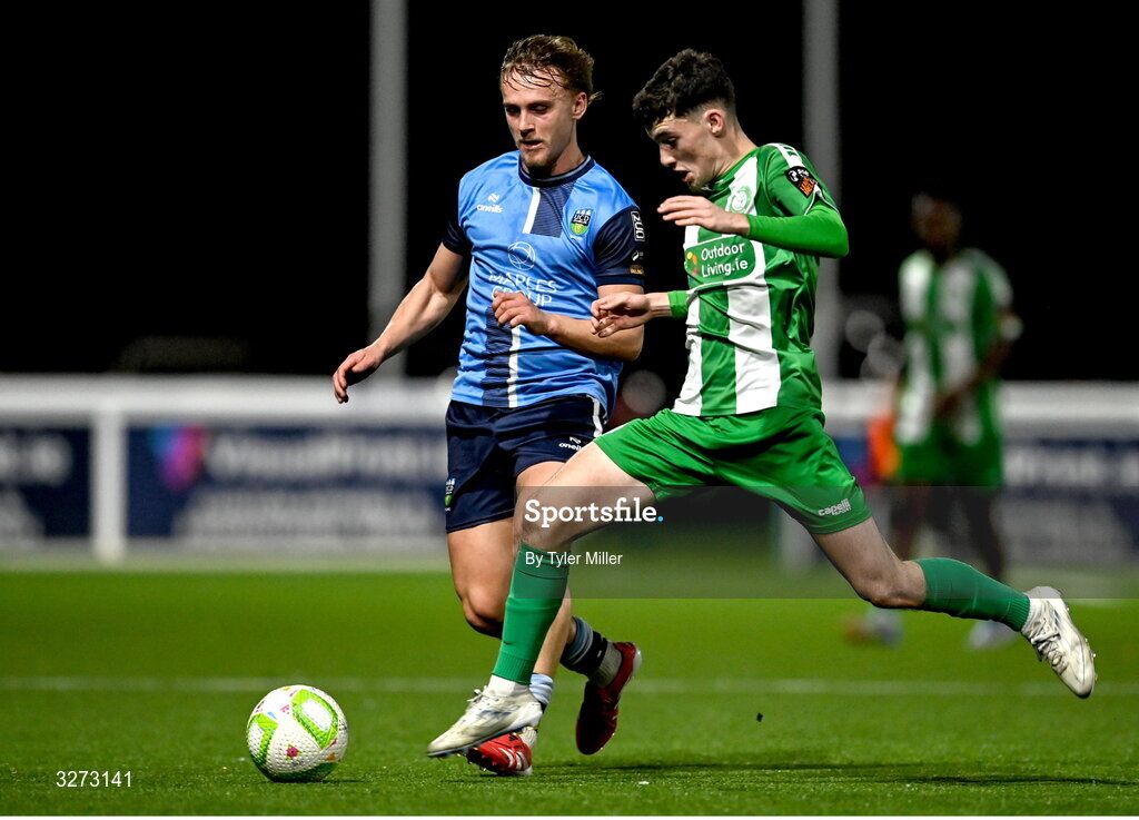 28 October 2025; Rhys Knight of Bray Wanderers in action against Brian McManus of UCD during the SSE Airtricity Men's First Division Play-Off semi-final second leg match between Bray Wanderers and UCD at Carlisle Grounds in Bray, Wicklow. Photo by Tyler Miller/Sportsfile