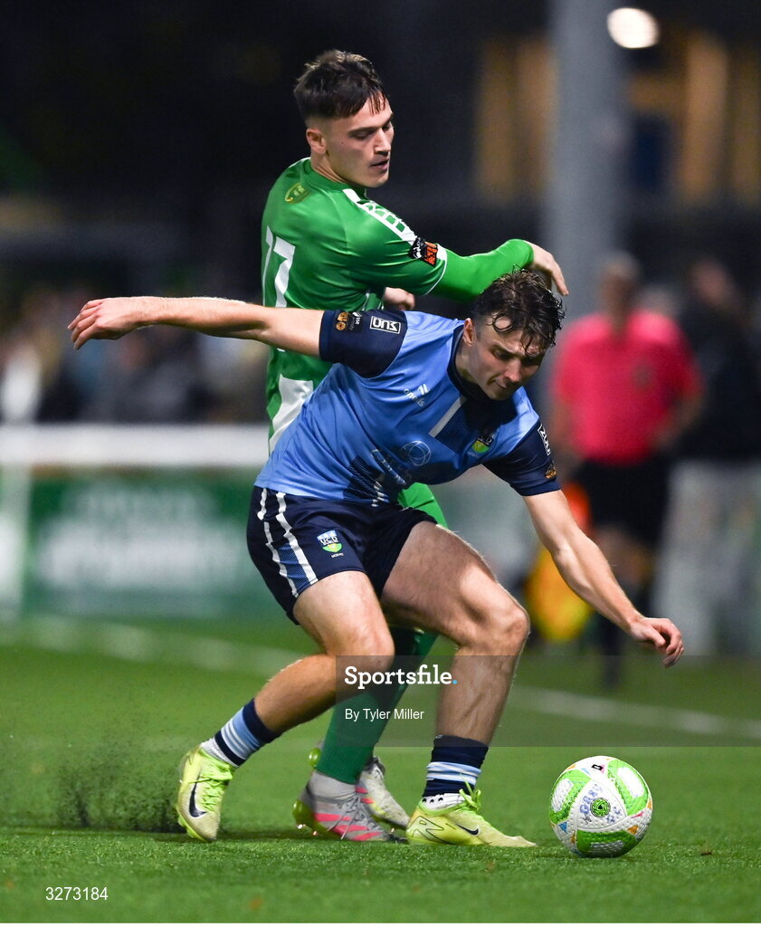 28 October 2025; Adam Wells of UCD in action against Justin Ferizaj of Bray Wanderers during the SSE Airtricity Men's First Division Play-Off semi-final second leg match between Bray Wanderers and UCD at Carlisle Grounds in Bray, Wicklow. Photo by Tyler Miller/Sportsfile