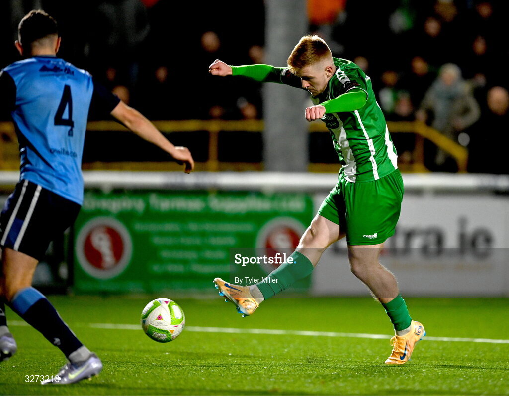 28 October 2025; Cian Curtis of Bray Wanderers shoots to score his side's second goal during the SSE Airtricity Men's First Division Play-Off semi-final second leg match between Bray Wanderers and UCD at Carlisle Grounds in Bray, Wicklow. Photo by Tyler Miller/Sportsfile