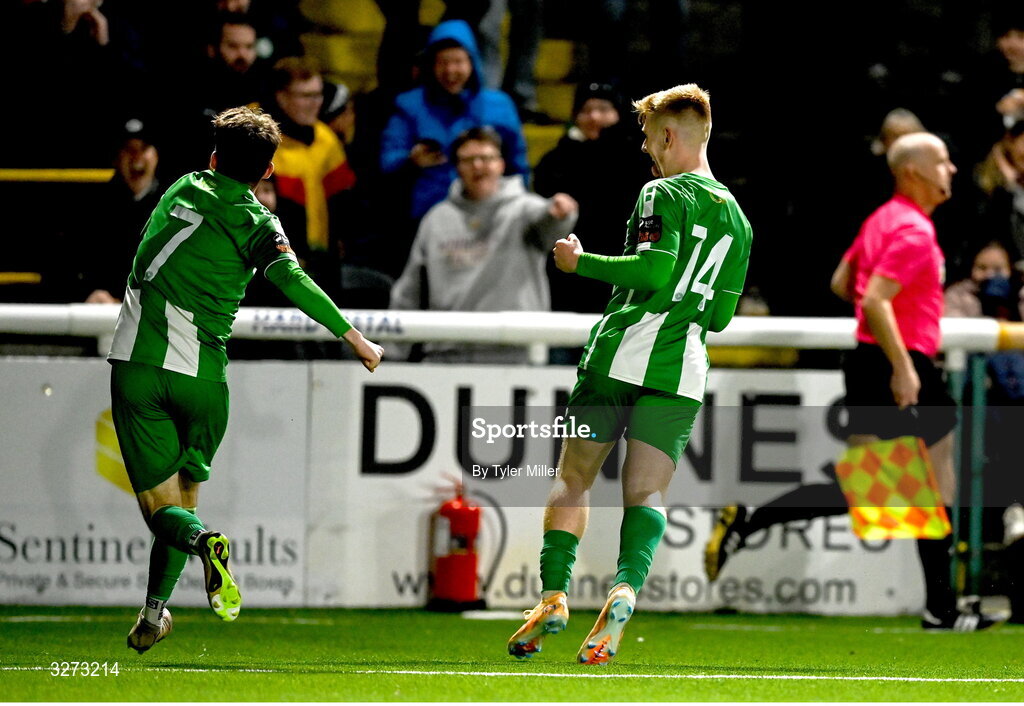 28 October 2025; Cian Curtis of Bray Wanderers, right, celebrates after scoring his side's second goal during the SSE Airtricity Men's First Division Play-Off semi-final second leg match between Bray Wanderers and UCD at Carlisle Grounds in Bray, Wicklow. Photo by Tyler Miller/Sportsfile