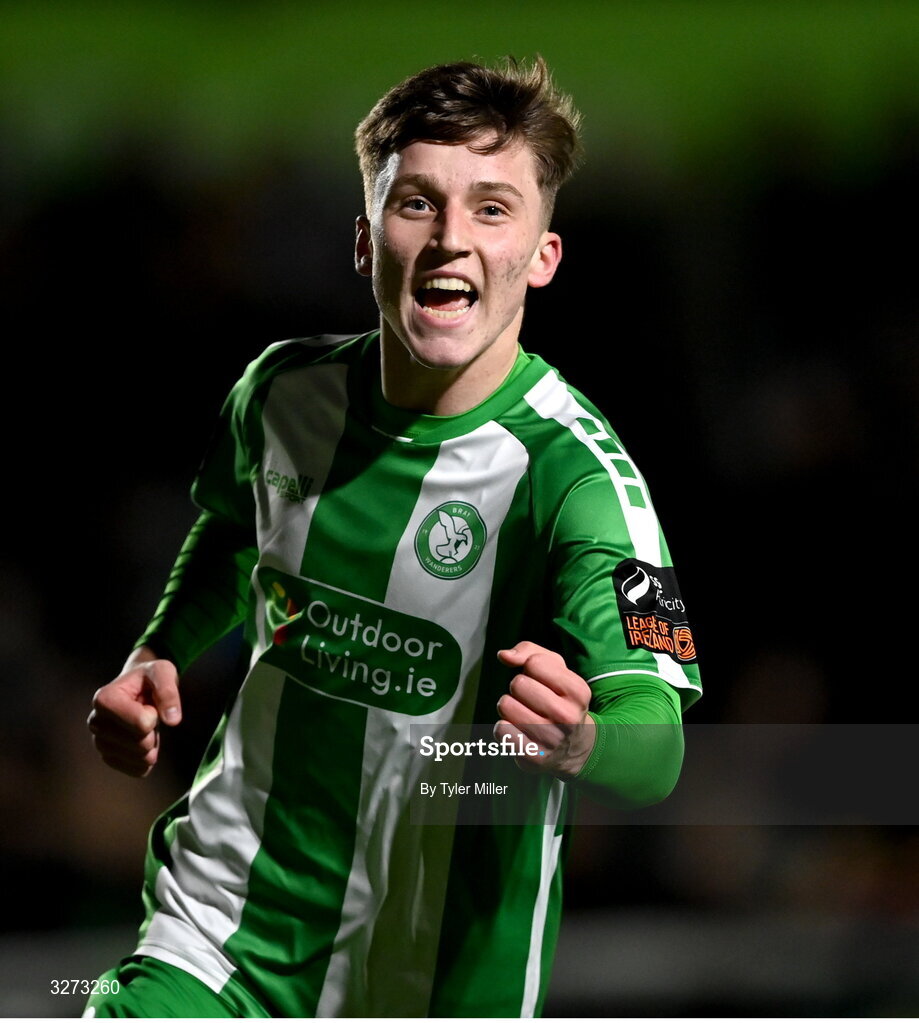 28 October 2025; Richard Ferizaj of Bray Wanderers celebrates after scoring his side's third goal during the SSE Airtricity Men's First Division Play-Off semi-final second leg match between Bray Wanderers and UCD at Carlisle Grounds in Bray, Wicklow. Photo by Tyler Miller/Sportsfile