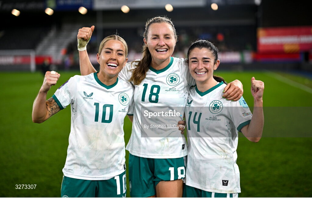 28 October 2025; Republic of Ireland players, from left, Denise O’Sullivan, Kyra Carusa and Marissa Sheva celebrate after the UEFA Women's Nations League A/B promotion/relegation play-off second leg match between Belgium and Republic of Ireland at The King Power At Den Dreef Stadium in Leuven, Belgium. Photo by Stephen McCarthy/Sportsfile