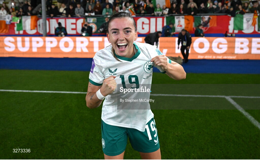 28 October 2025; Abbie Larkin of Republic of Ireland after the UEFA Women's Nations League A/B promotion/relegation play-off second leg match between Belgium and Republic of Ireland at The King Power At Den Dreef Stadium in Leuven, Belgium. Photo by Stephen McCarthy/Sportsfile