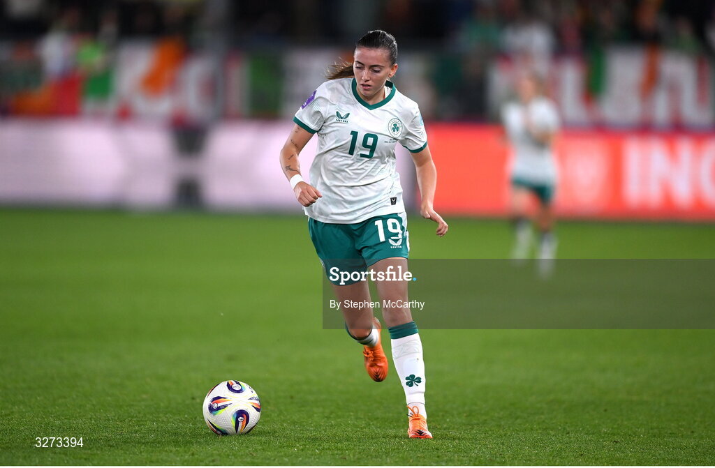 28 October 2025; Abbie Larkin of Republic of Ireland during the UEFA Women's Nations League A/B promotion/relegation play-off second leg match between Belgium and Republic of Ireland at The King Power At Den Dreef Stadium in Leuven, Belgium. Photo by Stephen McCarthy/Sportsfile