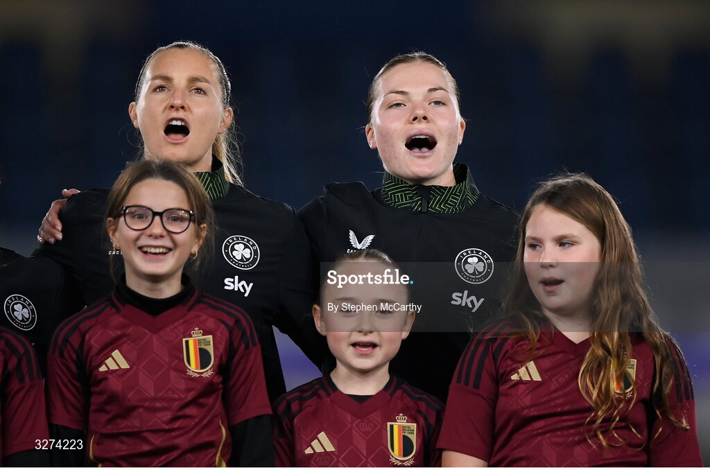 28 October 2025; Republic of Ireland's Kyra Carusa and Emily Murphy before the UEFA Women's Nations League A/B promotion/relegation play-off second leg match between Belgium and Republic of Ireland at The King Power At Den Dreef Stadium in Leuven, Belgium. Photo by Stephen McCarthy/Sportsfile