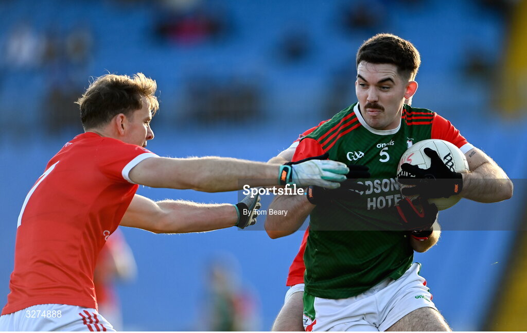 1 November 2025; Ruaidhrí Fallon of St Brigid's is tackled by Mark Richardson of Pádraig Pearses during the Roscommon County Senior Club Football Championship Final Replay between St Brigid's and Pádraig Pearses at King & Moffatt Dr Hyde Park in Roscommon. Photo by Tom Beary/Sportsfile