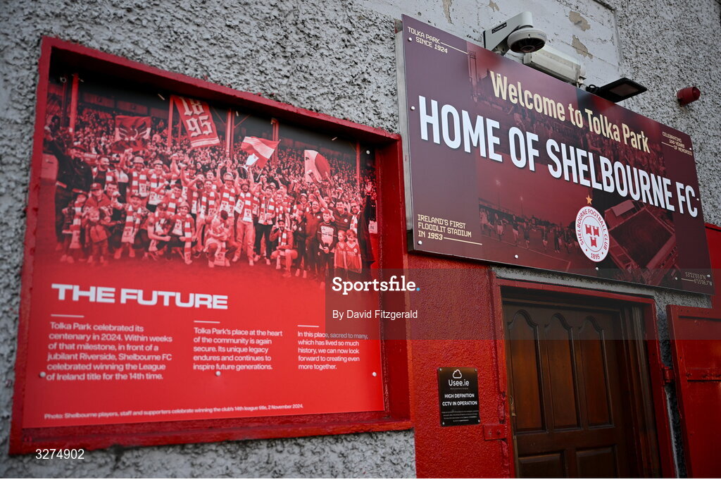 1 November 2025; Signs outside the stadium are seen before the SSE Airtricity Men's Premier Division match between Shelbourne and St Patrick's Athletic at Tolka Park in Dublin. Photo by David Fitzgerald/Sportsfile