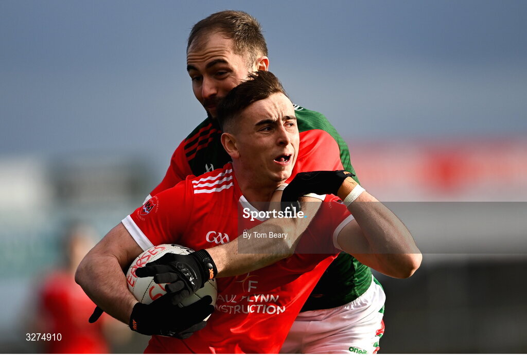 1 November 2025; Eoin Colleran of Pádraig Pearses is tackled by Ruairí Smith of St Brigid's during the Roscommon County Senior Club Football Championship Final Replay between St Brigid's and Pádraig Pearses at King & Moffatt Dr Hyde Park in Roscommon. Photo by Tom Beary/Sportsfile