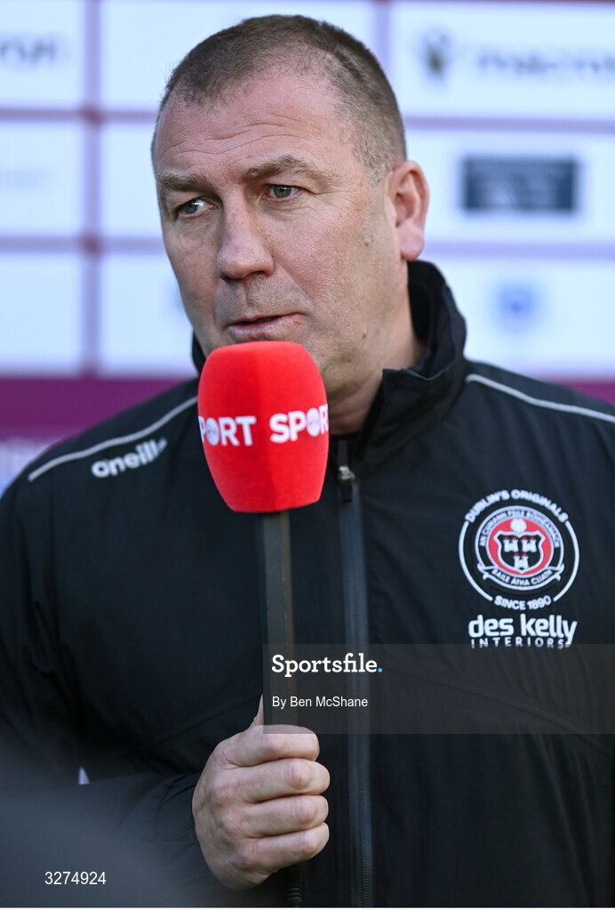 1 November 2025; Bohemians manager Alan Reynolds is interviewed before the SSE Airtricity Men's Premier Division match between Drogheda United and Bohemians at Sullivan & Lambe Park in Drogheda, Louth. Photo by Ben McShane/Sportsfile