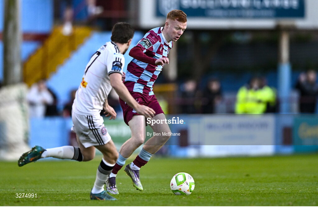 1 November 2025; Shane Farrell of Drogheda United in action against Adam McDonnell of Bohemians during the SSE Airtricity Men's Premier Division match between Drogheda United and Bohemians at Sullivan & Lambe Park in Drogheda, Louth. Photo by Ben McShane/Sportsfile