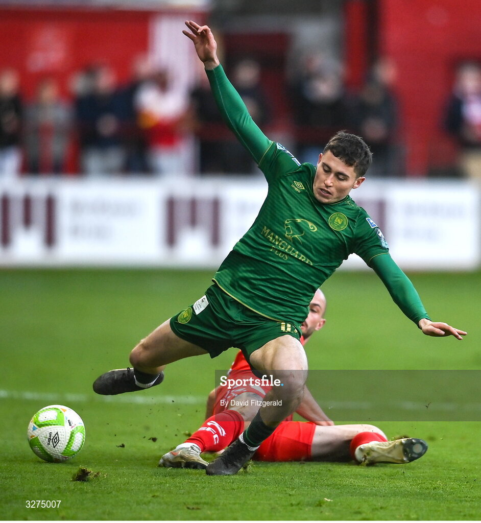 1 November 2025; Kian Leavy of St Patrick's Athletic is tackled by Mark Coyle of Shelbourne during the SSE Airtricity Men's Premier Division match between Shelbourne and St Patrick's Athletic at Tolka Park in Dublin. Photo by David Fitzgerald/Sportsfile