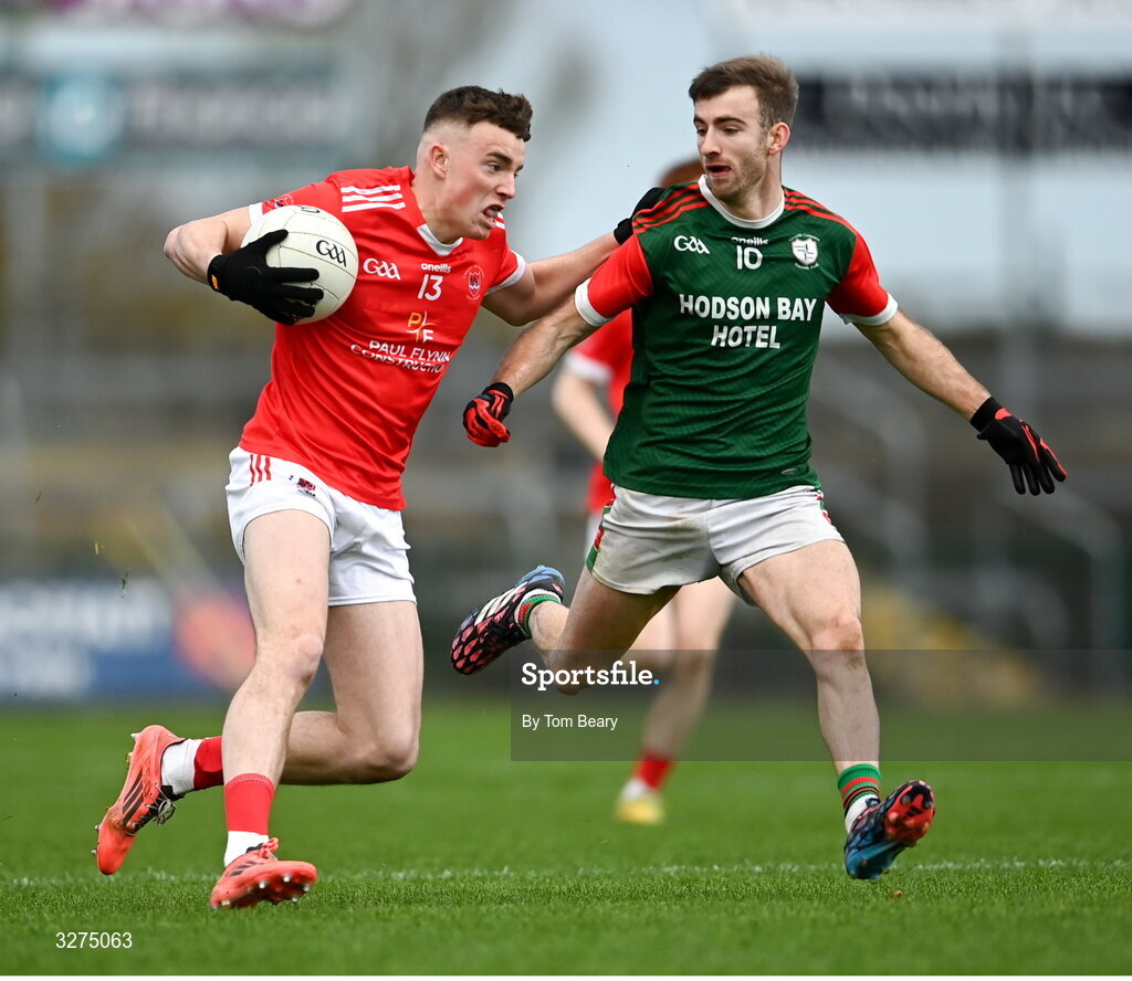 1 November 2025; Seán Canning of Pádraig Pearses is tackled by Paul McGrath of St Brigid's during the Roscommon County Senior Club Football Championship Final Replay between St Brigid's and Pádraig Pearses at King & Moffatt Dr Hyde Park in Roscommon. Photo by Tom Beary/Sportsfile
