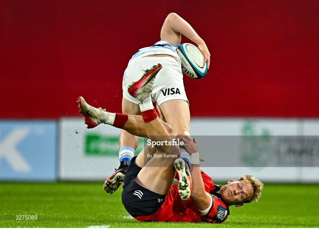1 November 2025; Santiago Pernas of Argentina XV is tackled by Mike Haley of Munster during the tour match between Munster and Argentina XV at Thomond Park in Limerick. Photo by Sam Barnes/Sportsfile