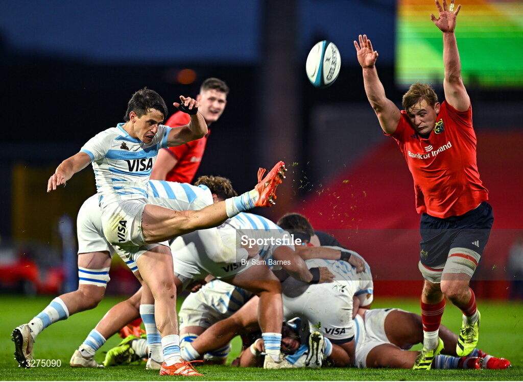 1 November 2025; Alejo Sugasti of Argentina XV in action against Gavin Coombes of Munster during the tour match between Munster and Argentina XV at Thomond Park in Limerick. Photo by Sam Barnes/Sportsfile